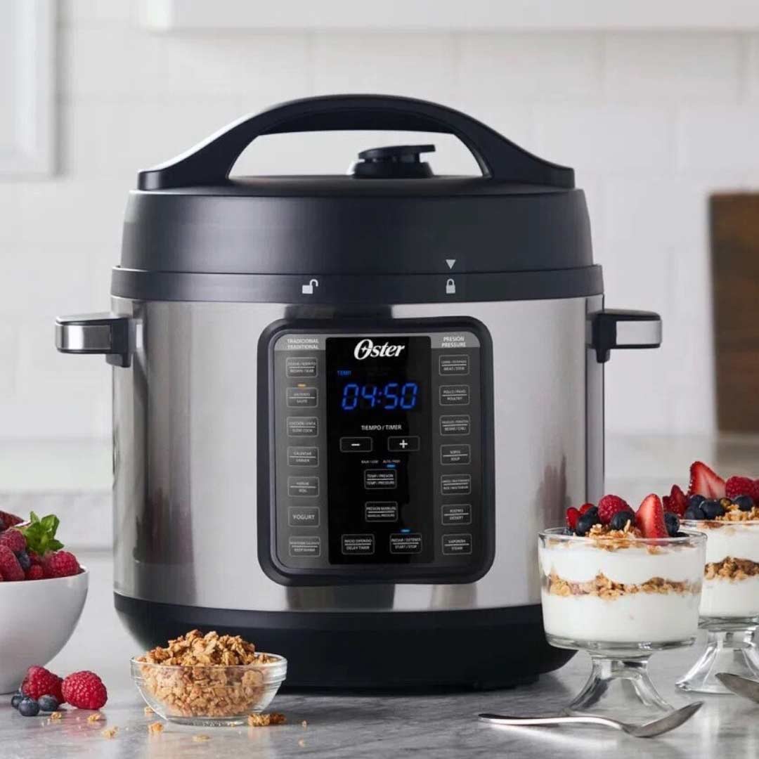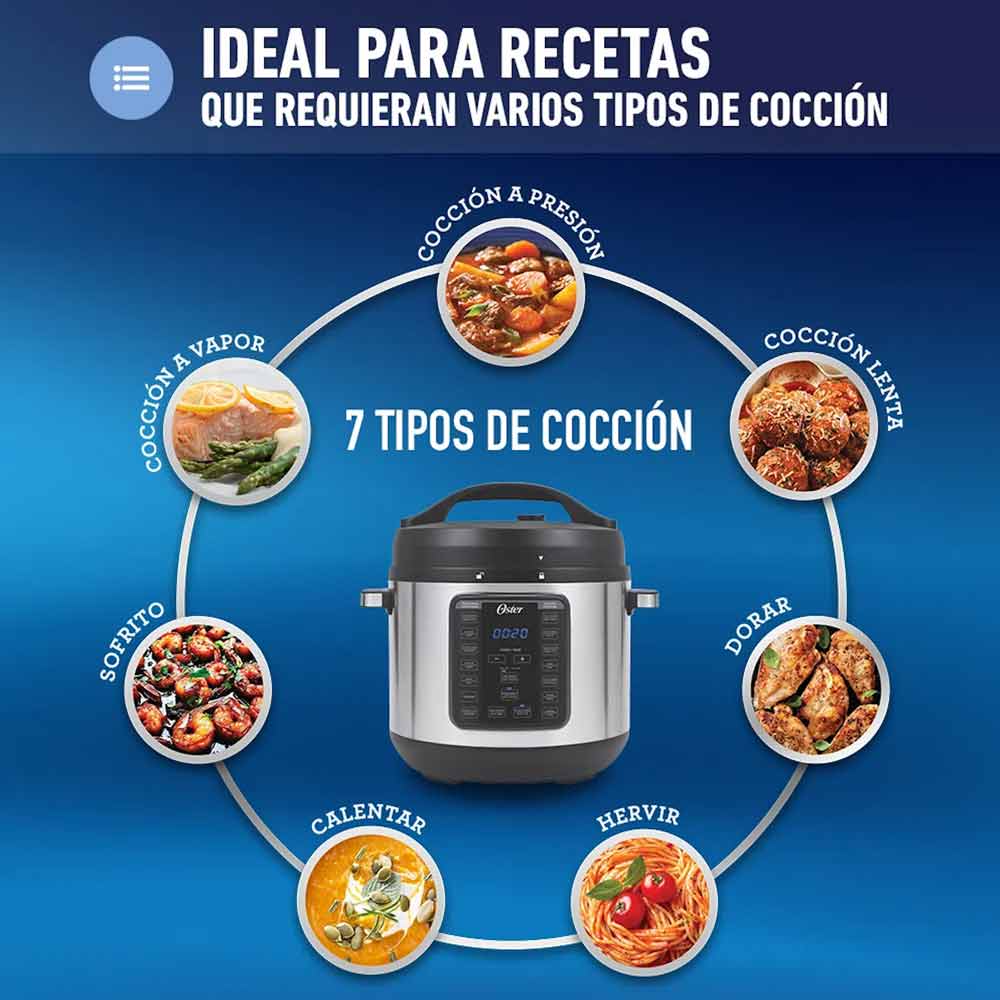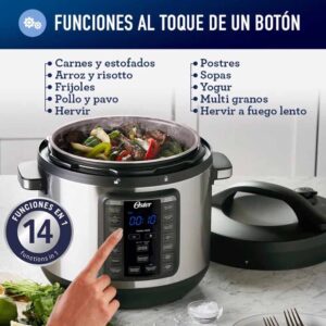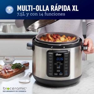 La multiolla Oster rápida XL 7,5L 14 funciones CKSTPCEC8801 te ayuda a preparar variedades de platos al toque de un botón. Ya sea que estés preparando tu comida por la mañana para dejarla cocinado durante el día, o si necesitas una preparación rápida y saludable en menos de una hora. Cuenta con 14 funciones en total: siete maneras de cocción (dorar, saltear, cocción lenta, cocción a presión, calentar, hervir y cocción al vapor) y 7 tipos de comidas (carne, pollo, sopas, frijoles, arroz, postres y yogur). La Multiolla rápida XL Oster 14 funciones CKSTPCEC8801 lo hace todo.