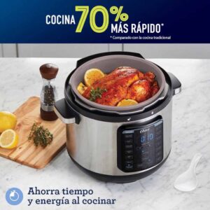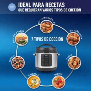 - Cocina rápidamente carnes, estofados, pollo y pavo, granos, arroz, postres, yogur y mucho más, utilizando las funciones pre-configuradas para cocinar a presión, cocción lenta, a vapor, saltear, sofreír o calentar